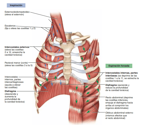 Los músculos más importantes que elevan la caja torácica son los intercostales externos, aunque otros músculos que contribuyen son: 1) los músculos esternocleidomastoideos, que elevan el esternón; 2) los serratos anteriores, que elevan muchas de las costillas, y 3) los escalenos, que elevan las dos primeras
