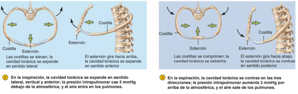 Los pulmones se pueden expandir y contraer de dos maneras: 1) mediante el movimiento hacia abajo y hacia arriba del diafragma para alargar o acortar la cavidad torácica, y 2) mediante la elevación y el descenso de las costillas para aumentar y reducir el diámetro anteroposterior de la cavidad torácica
