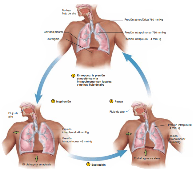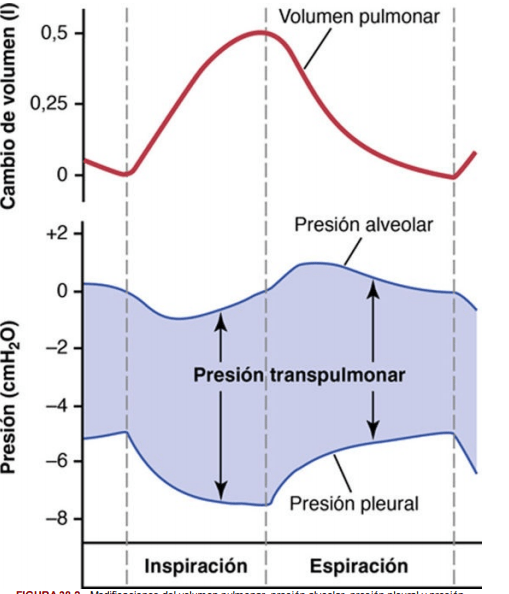 Cuando la glotis está abierta y no hay flujo de aire hacia el interior ni el exterior de los pulmones, las presiones en todas las partes del árbol respiratorio, hasta los alvéolos, son iguales a la presión atmosférica, que se considera que es la presión de referencia cero en las vías aéreas (es decir, presión de 0 cmH2O). Para que se produzca un movimiento de entrada de aire hacia los alvéolos durante la inspiración, la presión en los alvéolos debe disminuir hasta un valor ligeramente inferior a la presión atmosférica (debajo de cero).