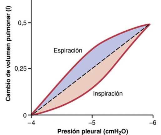 diferente para la inspiración y para la espiración. Cada una de las curvas se registra modificando la presión pleural en escalones pequeños y permitiendo que el volumen pulmonar llegue a un nivel estable entre escalones sucesivos. Las dos curvas se denominan, respectivamente, la curva de distensibilidad inspiratoria y la curva de distensibilidad espiratoria y todo el diagrama se denomina diagrama de distensibilidad de los pulmones.