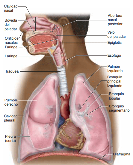 El aire se distribuye a los pulmones por medio de la tráquea, los bronquios y los bronquíolos.