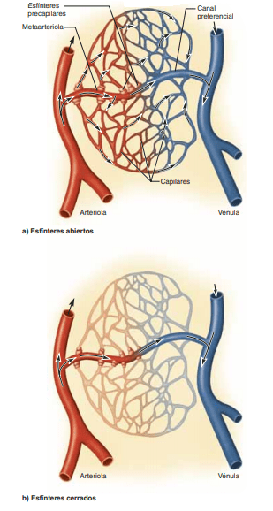 Las metaarteriolas no tienen una capa muscular lisa continua, sino fibras musculares lisas que rodean el vaso en puntos intermitentes, denominados esfínteres precapilares. La contracción del músculo en dichos esfínteres puede abrir y cerrar la entrada al capilar.