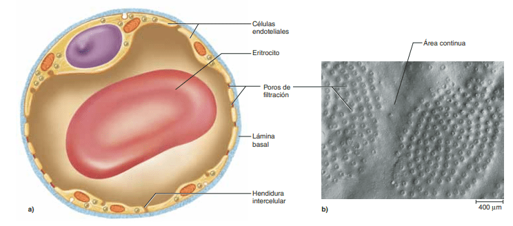 La fina pared capilar consiste en una única capa de células endoteliales. Los capilares son también muy porosos, con varios millones de hendiduras, o poros, entre las células que forman sus paredes en cada centímetro cuadrado de superficie capilar. Dada la elevada permeabilidad de los capilares para la mayoría de los solutos y dada su gran superficie, a medida que el flujo sanguíneo los atraviesa, una gran cantidad de sustancias disueltas se difunde en ambas direcciones a través de esos poros.