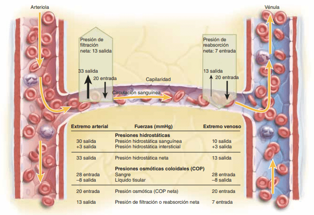 entre las células y, por último, se reabsorbe de nuevo hacia los extremos venosos de los capilares