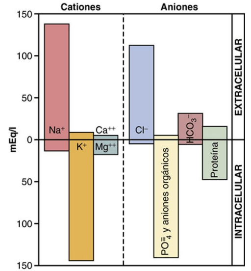 Al contrario que el líquido extracelular, el líquido intracelular contiene solo mínimas cantidades de iones sodio y cloro y casi ningún ion calcio. En cambio, contiene grandes cantidades de iones potasio y fosfato más cantidades moderadas de iones magnesio y sulfato, todos los cuales están en concentraciones bajas en el líquido extracelular. Además, las células contienen grandes cantidades de proteínas, casi cuatro veces más que en el plasma.